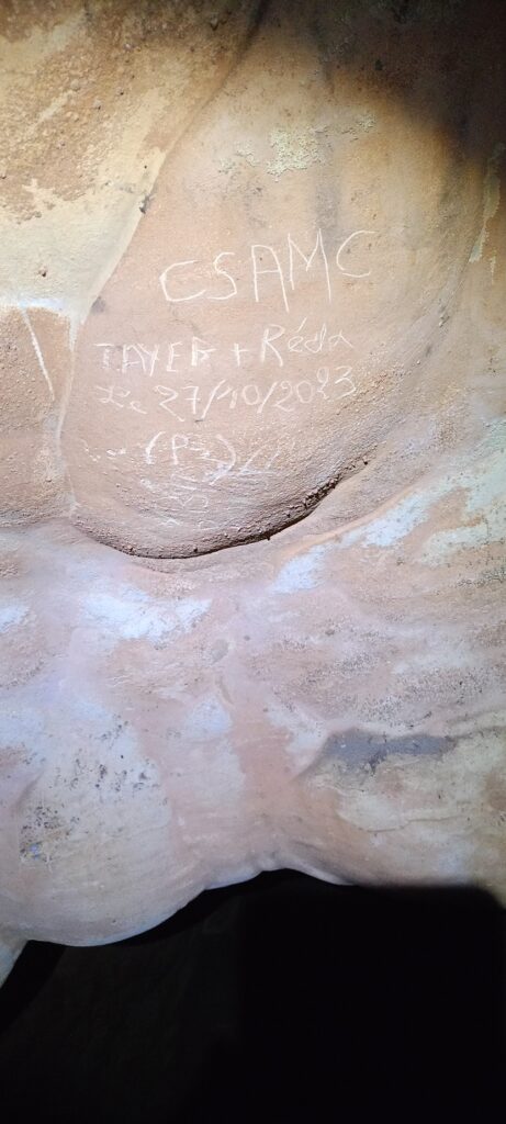 Plus préoccupant encore, certaines parois de la cavité portaient des gravures récentes : des noms, initiales et une date correspondant au passage de deux personnes appartenant à une autre association spéléologique active dans la région de Constantine. Ces marques, réalisées directement sur la roche tendre et fragile, laissent malheureusement une trace définitive sur un support qui s’est formé au fil de dizaines de milliers d’années.