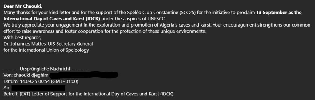 Au nom du Spéléo Club Constantine (SCC25), nous avons l’honneur d’exprimer notre plein soutien à l’initiative portée par l’Union Internationale de Spéléologie (UIS) et la République de Slovénie visant à proclamer le 13 septembre Journée internationale des grottes et du karst (IDCK) sous l’égide de l’UNESCO.