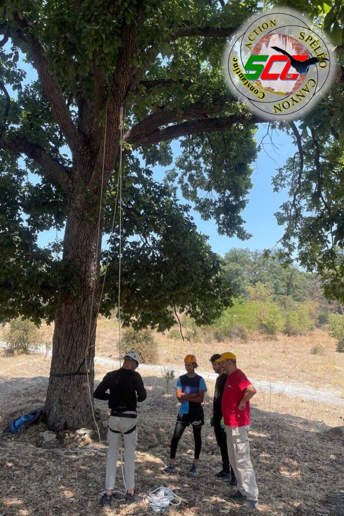 Sous l’ombre protectrice d’un majestueux chêne jaune centenaire – témoin silencieux des générations de spéléologues ayant aiguisé ici leurs compétences – les membres se sont réunis pour une journée intensive d’initiation et de perfectionnement aux manipulations de corde.