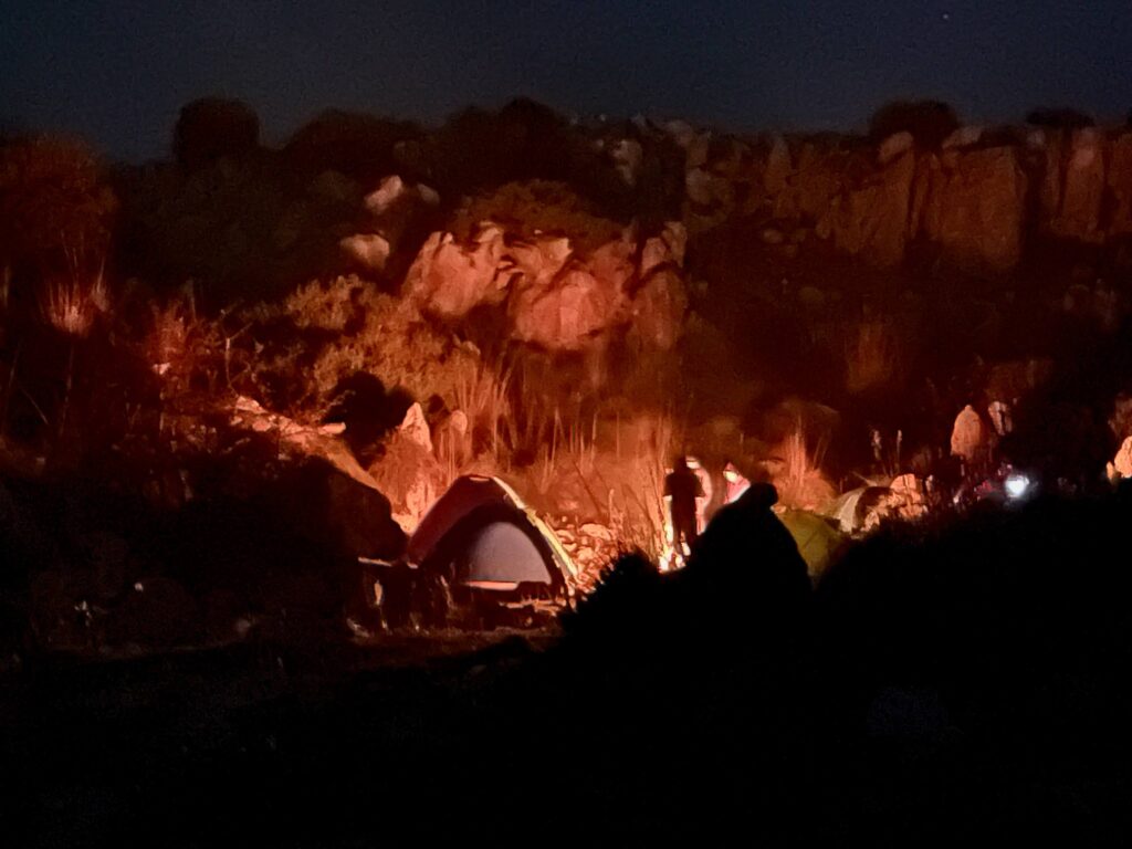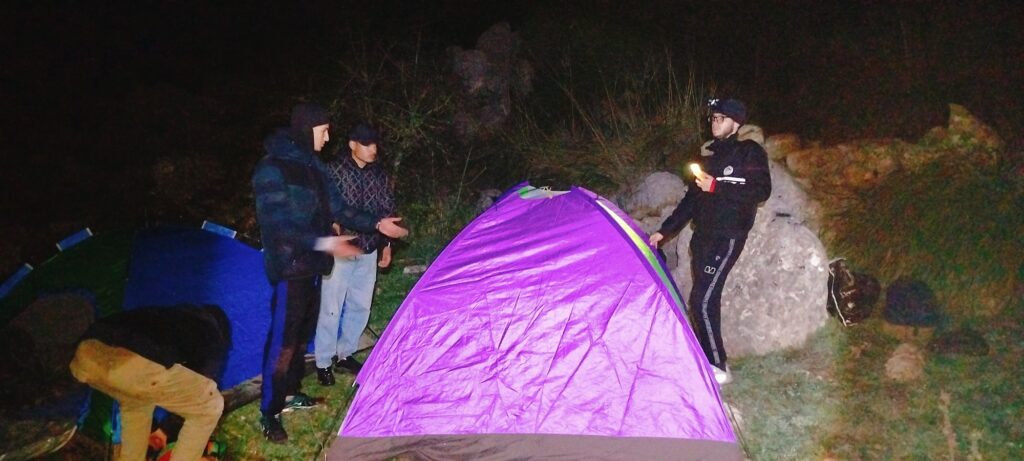 Face à cette situation, une décision stratégique a été prise : installer le campement à une distance légèrement inférieure à la zone initialement prévue et annuler l’ascension nocturne de la cime. Ce choix, dicté par des impératifs de sécurité, reflète la maturité du groupe et sa capacité à s’adapter aux réalités du terrain. La soirée s’est déroulée dans une ambiance conviviale et typiquement ramadanesque : installation du bivouac, préparation de l’iftar, allumage du feu de camp, suivi d’un moment d’échange et d’évaluation de la première journée, ainsi que la planification de la suite du programme.
