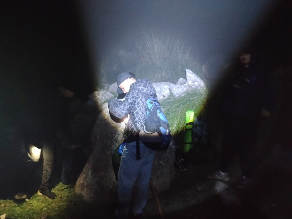 La marche s’est poursuivie dans les dernières lueurs du jour puis de nuit, à travers un relief accidenté. Contrairement aux prévisions annonçant de fortes pluies, les conditions météorologiques sont restées globalement favorables. Toutefois, un brouillard dense s’est progressivement installé, réduisant considérablement la visibilité malgré l’utilisation des lampes frontales.